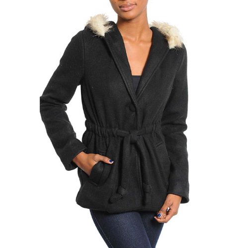 Long sleeves, hoodie with a fur trim, cinched waist, button front, casual jackets