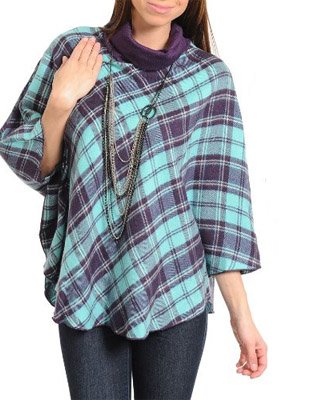 Women's poncho style Fall/Winter jacket featuring quarter-sleeves, turtleneck, checker print with attached necklace.